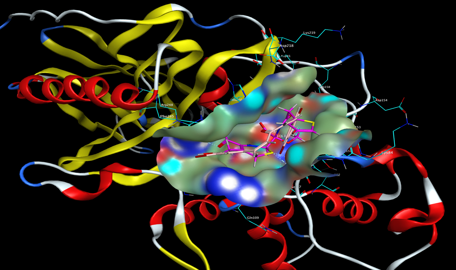 The validation of molecular docking protocol was performed to ensure that the receptors are proper to use in the molecular docking process. Based on the validation process, the obtained root mean square deviation (RMSD) is 1.7753 Å. It is less than 2 Å indicating that the docking protocol with receptor PDB 3MZE is valid and feasible for the advanced docking process (fig. 4) [15].