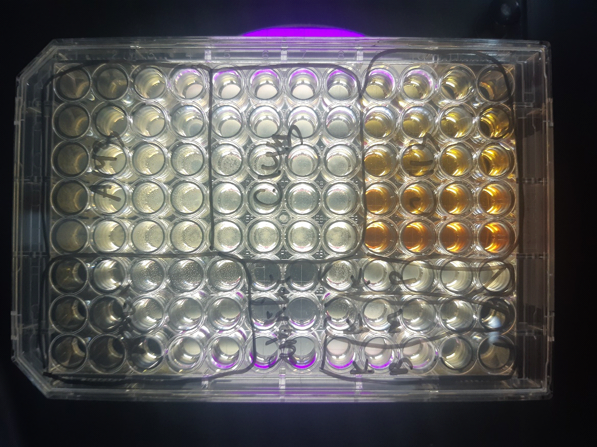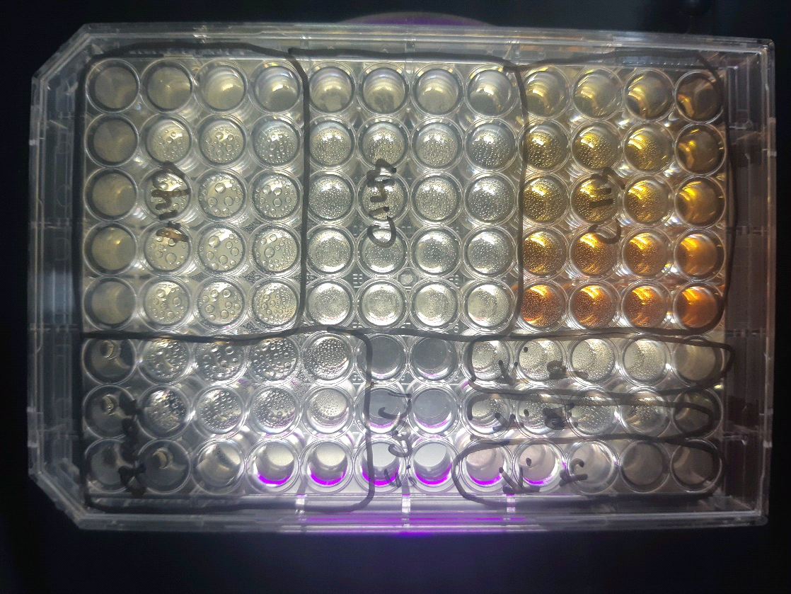 The antibacterial activities against ATCC 6538P, B. subtilis ATCC 6633 and E. coli ATCC 25922 were tested using liquid dilution method. For in vitro assay, A113 was prepared. BHI media (50 µl) was added into microplate 96 well; experimental compound (50 µl) was added into 1A until 1E column. The obtained concentrations of the dilution method is 0.5 mg/ml, 0.25 mg/ml, 0.125 mg/ml, 0.063 mg/ml, and 0.031 mg/ml respectively. Selected bacteria (50 µl) was added into each well. Solvent control, compound control, and media control were prepared in the same microplate. The incubation was conducted for 24 h at 37 °C. It was then measured using microplate reader (595 nm). This method was used to determine the inhibitory concentration of the investigated compounds which showed inhibitory effect on the growth of the tested bacteria. This concentration was considered as inhibitory concentration (IC50).