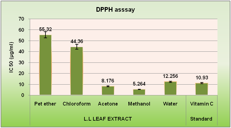 The free radical-scavenging activities in stem and leaf of the plants L. laevigata samples along with standards vitamin C was determined by the DPPH radical scavenging assay and the results are shown in fig. 1. The reduction in absorbance of the DPPH radical caused by antioxidant was because of the rummaging of the radical by hydrogen ability. The colour change from purple to yellow is visually evident. A lower value of IC50 (inhibitory concentration at 50%) indicates a higher antioxidant activity. Generally, the acetone and methanol extracts of all the part showed a significant reduction of DPPH radical. However, L. laevigata is the highest free radical scavenging activity was exerted by petroleum ether and chloroform extract of leaf (IC50 value were 5.26µg/ml). It has been generally used to test the capacity of mixes as free-radical scavengers or hydrogen contributors and to assess the antioxidative action of plant concentrates and nourishments [28].