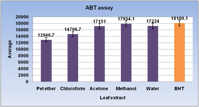 The chloroform, acetone, and methanol extracts from the leaves of L. laevigata was a fast and effective scavengers of the ABTS radical (table 7). In ABTS•+scavenging activity the values are varied significantly high ranged from (17954.1 μmol BHT/g) methanol extract. Infect, the ABTS radical cation scavenging activity also consider hydrogen-donating capacity [35] and reported that the high molecular weight phenolic (tannins) have more ability to quench free radicals (ABTS•+). Since, the extracts from various samples have the ability to scavenge free radicals, thereby preventing lipid oxidation via a chain breaking reaction; they could serve as potential nutraceuticals when ingested along with nutrient.