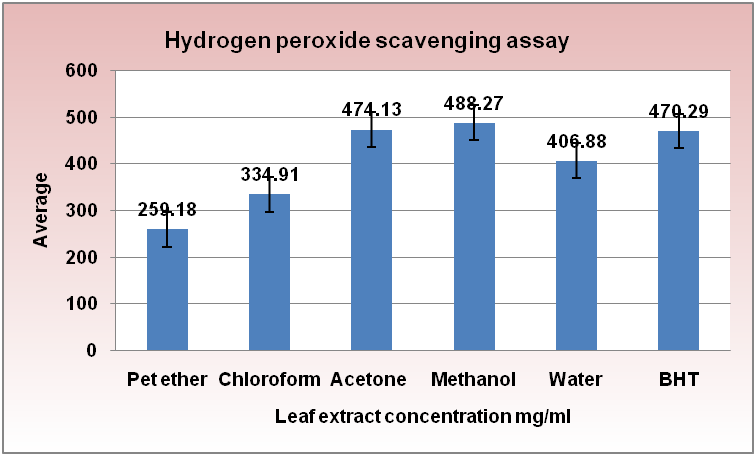 The ability of the extract to scavenge hydrogen peroxide was determined according to the method given of Ruch et al., 1989 [23]. The solution of hydrogen peroxide (2 mmol/l) was prepared in phosphate buffer (pH 7.4). Plant leaf extract (1-10μg/ml) were added to hydrogen peroxide solution (0.3 ml). Absorbance of hydrogen peroxide at 230 nm was determined after 10 min against a blank solution containing buffer without hydrogen peroxide and compared with ascorbic acid, the reference compound.