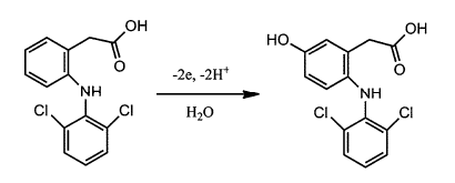 Oxidation of DFC takes place at the positive potential, which depends on pH and the type of the electrode used. pH effects show oxidation potential is pH dependent with a slope of -0.0539 mV/pH which was equal to the expected Nernst value for a two-electron, two-proton electrochemical reaction. The number of electrons calculated was 2.0. Based on the experimental observations and earlier reported results [15, 42-44], electro-oxidation of diclofenac leads to 5-OH diclofenac as shown in scheme 1.