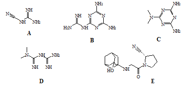 Fig. 1: Chemical structures of (A) metformin (MET)-related compound A, (B) MET-related compound B, (C) MET-related compound C, (D) MET, and (E) vildagliptin