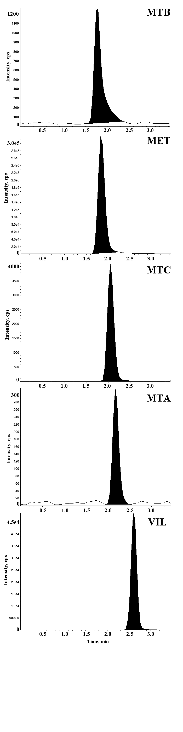 The high sensitivity of the method developed in the present study was demonstrated its low LOD, estimated at 0.5 ng/mL for VIL and MET and 0.6 ng/mL for MTA, MTB, and MTC. The LOQ was estimated at 1.5 ng/mL for VIL, 2.5 ng/mL for MTA, and 2 ng/mL for MET, MTB, and MTC.
