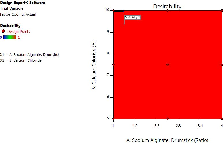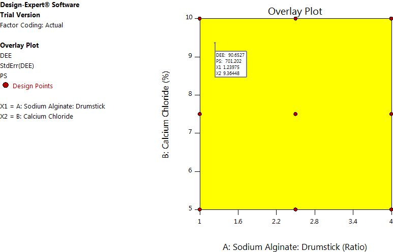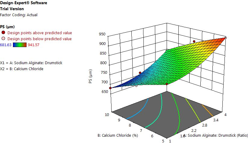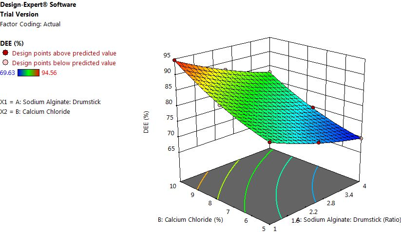 Where Y is the response, b0 is the intercept, and b1, b2, b3, b4, b5 are regression coefficients. X1 and X2 are individual effects. X12and X22are model quadratic effects; X1X2 is the interaction effects. One-way ANOVA was applied to estimate the significance (P<0.05) of generated models. Individual response parameters were evaluated using the F-test. The response surface methodology was applied to analyze the effect of independent factors (SA: Drumstick mucilage and CaCl2) on the measured responses (DEE and PS).