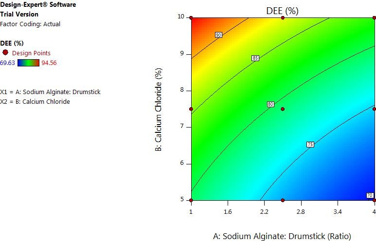 Fig. 6: Contour Plots showing, an effect of sodium alginate-drumstick mucilage and concentration of CaCl2 on DEE