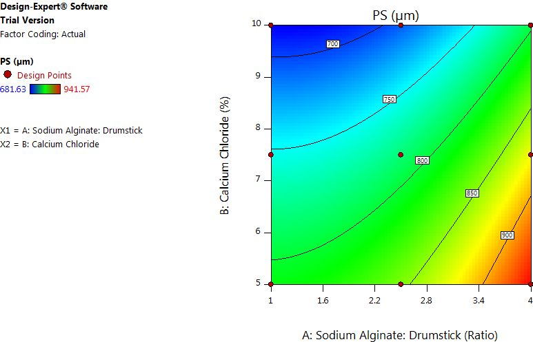 Fig. 8: Contour plot showing, the effect of sodium alginate-drumstick mucilage and concentration of CaCl2 on particle size