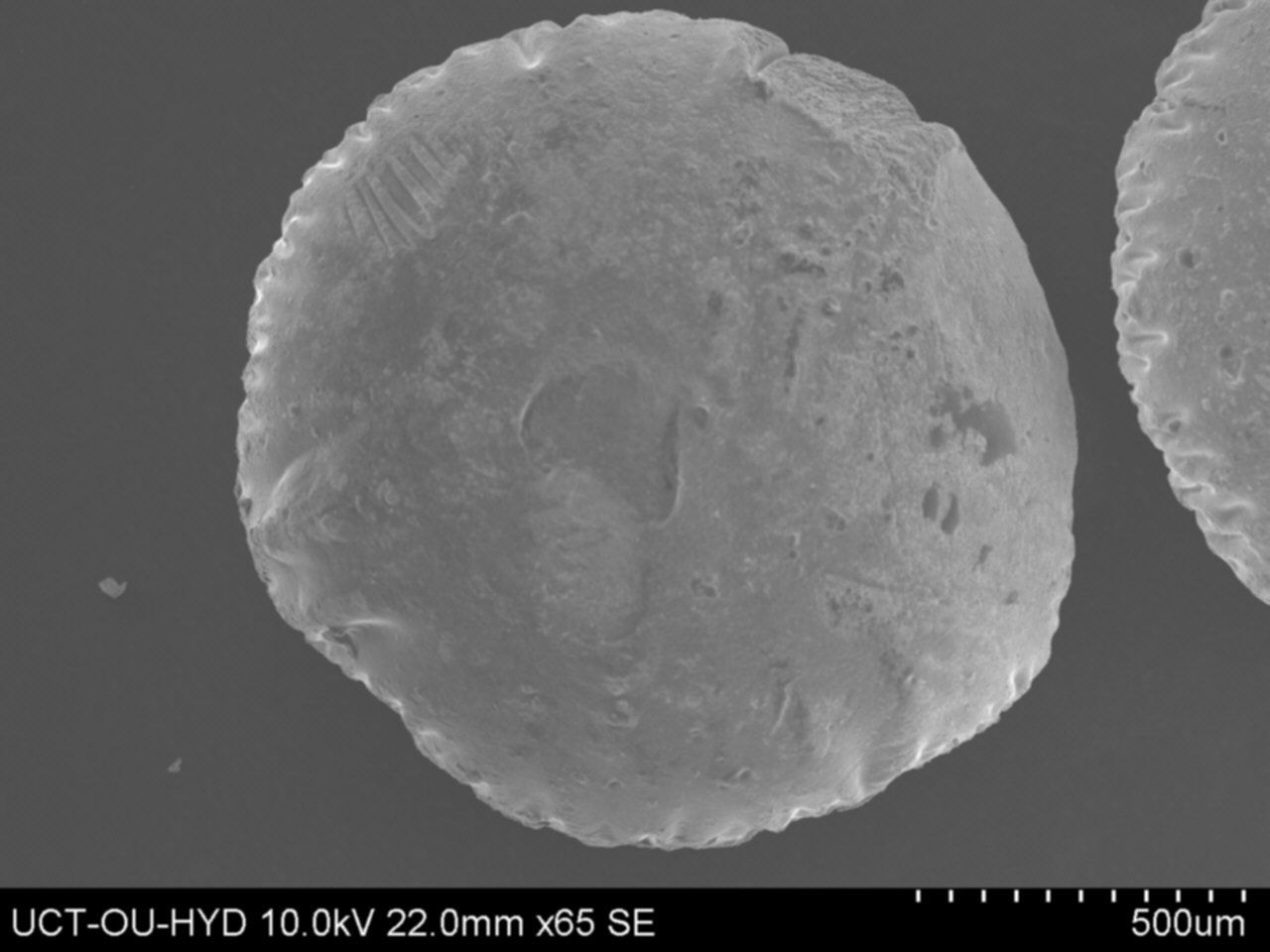 The PS, shape and surface morphology of optimized mucoadhesive microspheres were examined by scanning electron microscopy. Mucoadhesive microspheres were fixed on aluminum studs and coated with gold using a sputter coater SC 502, under vacuum [0.1 mm Hg] and are analyzed using-Model JSM-840 A, Joel. Japan.
