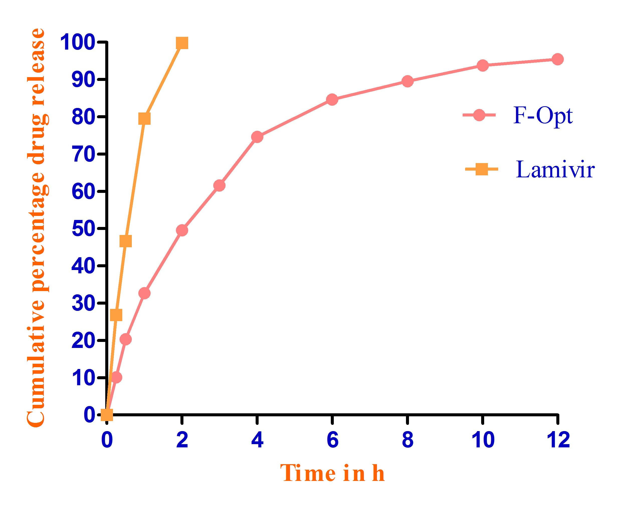 The in vitro lamivudine release studies were carried out for optimized drumstick mucilage-alginate microspheres of lamivudine and marketed Lamivir Tablet, in the phosphate buffer pH 7.4. The optimized microspheres showed the release of lamivudine over a period of 12 h as shown in fig. 12. The release of drug lamivudine from these drumstick mucilage-alginate microspheres was controlled and prolonged in phosphate buffer (pH 7.4), due to the higher swelling rate of these microspheres in phosphate buffer.
