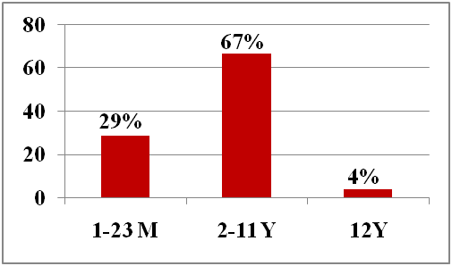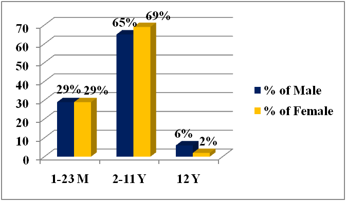 The number of male patients (65%) and female patients (69%) was found to be significantly high in the age group 2-11 y (children) when compared to the number of male patients (6%) and female patients (2%) in the age group of 12 y (adolescents). An equal number of male and female patients (29%) was observed in the age group 1 mo — 23 mo (infants and toddlers).