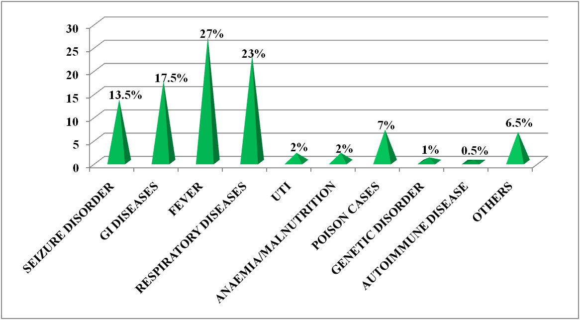 The majority of paediatric patients were taken to the hospital due to fever and it was 54 (27%). Second comes respiratory disease 46 (23%). Gastrointestinal disorder was found to be 35 (17.5%) and then comes seizure disorder 27 (13.5%). Paediatric patients admitted with poisoning cases were 14 (7%) and with genetic disorder is 1 (0.5%). Paediatrics admitted due to urinary tract infection and anaemia/malnutrition were found to be equal 4 (2%). Only 1 (0.5%) is admitted due to autoimmune disease and 13 (6.5%) belong to other diseases. An earlier study reported that respiratory system disease (25.6%), was most commonly seen, followed by fever (19.2%), GIT (18.4%) and hepatitis (8.8%) disorders [6].