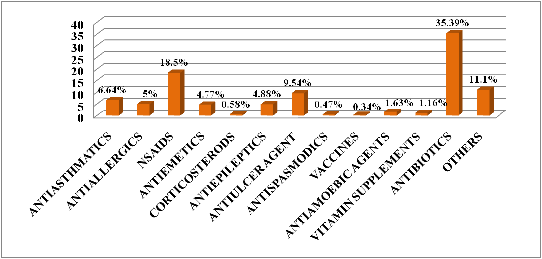 The highest prescribed drug class is antibiotics 304 (35.39%). Second commonly prescribed drugs belong to nonsteroidal anti-inflammatory drugs (NSAIDs) 159 (18.5%). 57 (6.64%) number of drugs prescribed are anti-asthmatics, 43 (5%) are anti-allergic, 41 (4.77%) are antiemetic, 5 (0.58%) are corticosteroids, 42 (4.88%) number of drugs belong to anti-epileptic, 82 (9.54%) are anti-ulcer agents, 14 (1.63%) are anti-amoebic agents, 10 (1.16%) are vitamin supplements and 4 (0.47%) are antispasmodic. The least prescribed drugs are vaccines 3 (0.34%). The rest of drugs 95 (11.1%) are categorized as others. A previous study reported that analgesic drugs were the most frequently prescribed therapeutic class of drugs (26.9%) [12].