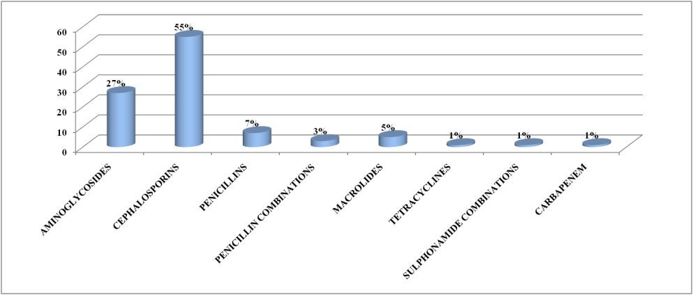 Among antibiotics, cephalosporin 167(55%) are the most prescribed and then comes aminoglycosides 83 (27%). 22 (7%) number of drugs is penicillin, 15 (5%) are macrolides and 11 (3%) are penicillin combinations. Equal number of drugs 2 (1%) are prescribed as tetracyclines, carbapenem and sulphonamide combinations. In a study, it was found that the most frequently prescribed group of antibacterial were cephalosporin (62%) followed by penicillin [13].