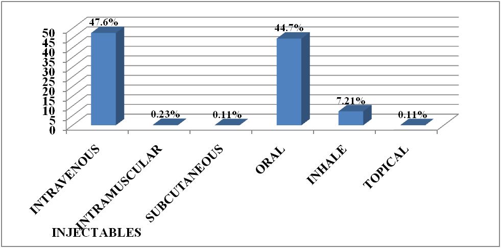 The majority of drugs were administered in injectable form 412 (47.94%), in which the intravenous route is most commonly administered 409 (47.6%). Only 2 (0.23%) of drugs are administered via intramuscular route and 1 (0.11%) is given via subcutaneous route. Oral route is contributing around 384 (44.7%). Inhalation route contributes around 62 (7.21%) and topical was only 1 (0.11%). In another study it was found that 85.6% of medications are oral medications, 4.4% of cases consist of inhalational drugs, 8.6% of cases are topical drugs and 1.3% are suppositories or pessesaries [14].