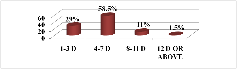 While considering the comorbidity 69 (34.5%) prescriptions out of 200 are having 1 comorbidity, 9(4.5%) are prescriptions with 2 co morbidity and only 2 (1%) are prescriptions with ≥ 3 comorbidity. Majority of the prescriptions 117 (58.5%) show a duration of hospital stay for 4-7 d, 58 (29%) number of patients stayed in the hospital for 1-3 d, 22 (11%) number of patients were stayed for a period of 8-11 d and 3 (1.5%) patients were stayed for 12 or more days. 161 (80.5%) number of patients were discharged after completion of treatment and 8 (4%) were referred for better treatment. 21 (10.5%) were discharged at the request and 10 (5%) were absconded during the study.
