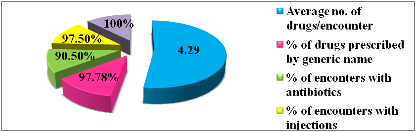 Prescribing of injections is not within the WHO recommended range<20% and it was far higher showing 97.5%. However, this increased prescribing of injection is not irrational as the recommended range is for outpatients. Due to the severity of illness, unavailability of oral and other dosage forms for a particular drug and to increase medication adherence injection formulation may be prescribed more. Nevertheless, the overuse of injections may lead to economic cost and health hazards. In a previous study it was found that average number of drugs per prescription as 4 and percentage of drugs prescribed by generic name as 45%. The percentage of antibiotics prescribed was 33% and percentage of encounters with an injection in that study was 30.6% [6].