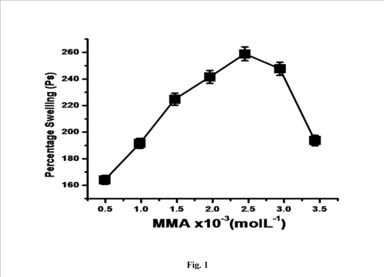 The optimum concentration of mma for maximum Ps (258.9%) was found to be 2.45 x 10-3 mol/l (fig. 1). However, beyond the optimum monomer concentration, the further rise in the monomer content leads to a reduction in Ps. The obtained behavior is ascribed to predominance of cross-linking and compactness of the candidate polymer over Ps.