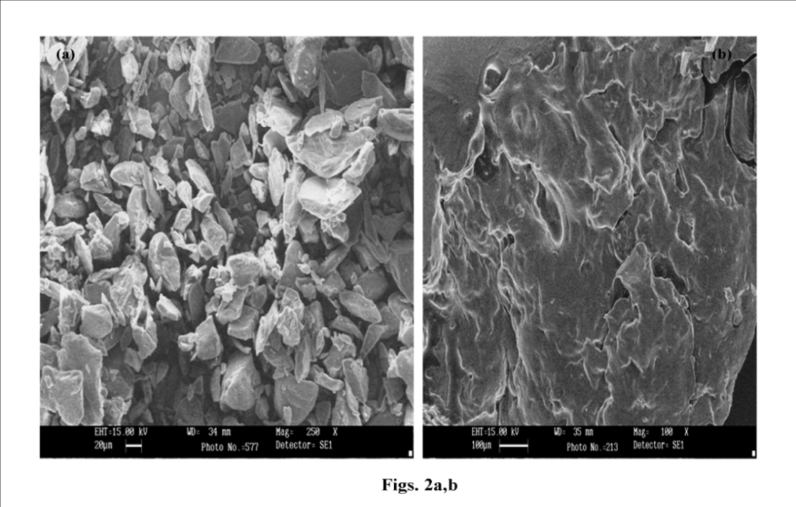 The morphological study of the backbone and IPN was carried out using SEM. SEM images of both the samples displayed changes in the surface morphology. SEM images of gt revealed homogeneous surface, while gt-cl-poly (aa-ip-aam+mma) has shown morphological variation due to cross-linking present in the gt-cl-poly (aa-ip-aam mma)+(fig. 2a,b). The SEM images certainly revealed morphological differences in the characteristics of gt and functionalized gt. The variation in surface morphologies taken place due to grafting of paa chains onto gt and further interpenetrating of paam and pmma chains in the gt-cl-paa matrix resulting in the formation of ipn hydrogels. The IPN hydrogel was more compact and stable through cross-linking with glutaraldehyde [29-32].
