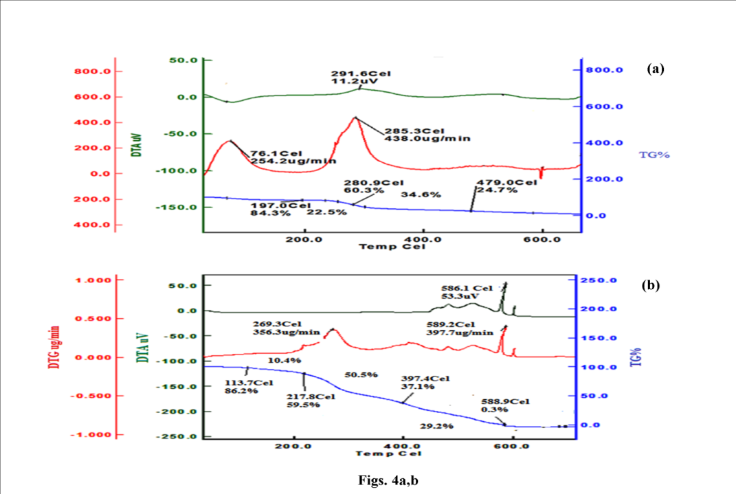 Two stages breakdown was found in the TGA of gt. The first stage breakdown occurred due to the subtraction of H2O and impulsive molecules, whereas the second phase of breakdown was due to the polymer chains due to the de-polymerization reactions. The first phase breakdown appeared at a temperature from 196.9 °C-281 °C with 22.5% wt. loss 22.5%. The second phase breakdown occurred at 479.0 °C (fig. 4a). DTG of Gt showed breakdown at 75.9 °C (wt. loss 253.9 ug/min) and 285.3 °C (wt. loss 437.9 ug/min.). DTA result gave exothermic peak at 292.1 °C (energy loss 11.2 uV) (fig. 4a).