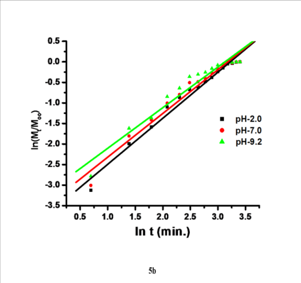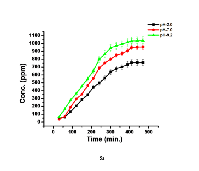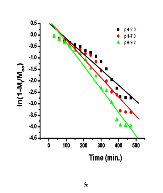 The drug entangled in the ipn was found to be released after the dissemination of the water from the ipn, which resulted in the distension of the ipn device and liberation of the imbibed drug molecules. The drug diffusion started at the ipn surface, after its swelling. So, drug release was linked to the swelling characteristics the ipn matrix [22, 28]. ipn was observed to work as a useful device for systematic liberation of the drug. It is apparent from the fig. 5a, that IPN showed the initial release 66.08 ppm after 30 min. with initial diffusion coefficient i.e. DI = 7.4, in alkaline medium followed by (49.98 ppm) at acidic medium i.e. (2.0 pH) (DI = 5.3) and least release 37.96 ppm at neutral pH (DI = 1.78). Equilibrium was attained after 8 h with maximum release 1033.21 ppm followed by 959.65 ppm and 757.89 ppm at alkaline, neutral and acidic pH, respectively. The drug liberation kinetics showed that the drug liberation behavior increased with increased in pH. This behavior can be discussed on the fact that at acidic pH,–COOH groups present in unionized form, this leads to the distortion of the IPN matrix. As the pH increases–COOH ionize to–COO-and thus, keep away from one another leads to increase the pantoprazole sodium liberation from IPN device. Drug liberation showed non-fickian diffusion mechanism at alkaline pH, Case II diffusion at acidic and neutral pH (table 3). This clearly indicated that in alkaline medium drug liberation rate is similar to the relaxation time of ipn device. Whereas, in acidic and neutral media, drug liberation was faster as compared to the relaxation time of the ipn. The value of gel characteristics constant i.e. ‘K’ was greater at alkaline pH, which revealed that highest drug liberation occurred at pH 9.2. DI has lesser value as compared to DL, this showed slower drug liberation in the initial stage than the lateral stage [32]. All the experiments were carried-out in triplicate, so as to maintain the accuracy and reproducibility.