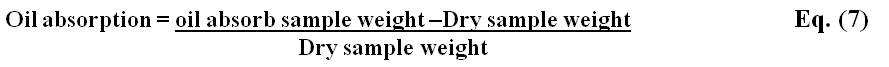 Biomaterial powder was used to determine the oil absorption The samples were accurately weighed (0.25 g) into centrifuge tube, added with 5 ml refined oil, mixed by vortex stirrer for 1 min, kept at room temperature for 30 min and centrifuged at 10000 rpm for 30 min. Then the supernatant was removed, and the tube was kept upside down for 1 min. Finally weighed the oil absorbed sample weight and calculated the oil absorption by the following equation-7.