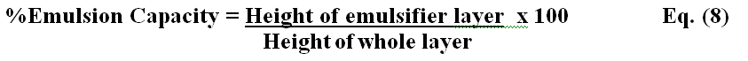 Biomaterial powder was used to determine the emulsion capacity. The samples were accurately weighed (100 mg), dissolved in 5 ml distilled water, and added with 5 ml oil. Then prepared the emulsion and centrifuged with 4000 rpm for 5 min. Finally measured the height of emulsified layer compared with the height of whole layer and calculated the emulsion capacity by the following equation-8.