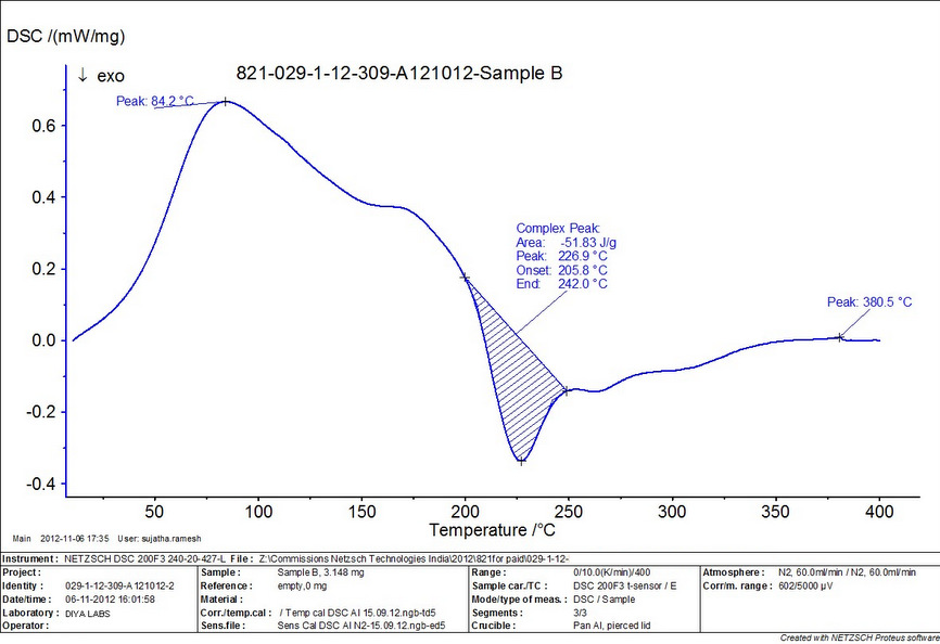 A sharp symmetric melting endotherm can indicate relative purity, whereas broad asymmetric curve suggests impurities or more than one thermal process. The endothermic peak usually indicates the loss of water present in the compound. The DSC curve of Phaseolus vulgaris showed exothermic peak at temperature 84.2 °C and endothermic peaks at temperature 226.9 °C. DSC graph is shown in Fig. 2.