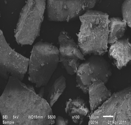 The SEM photograph of dried isolated biopolymer (powdered sample) was obtained by Scanning Electron Microscope (Jeol, JSM-840A, Japan) with 20Kv accelerating voltage and image are shown in Figure 3.