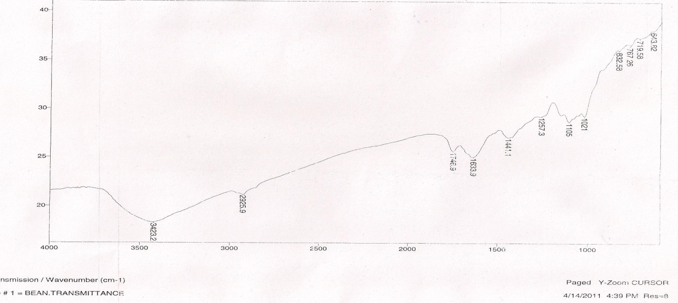 The biomaterial was extracted from the Phaseolus vulgaris by using a simple and economical process [4]. The pulp of Phaseolus vulgaris was collected, minced with distilled water and filtered through muslin cloth. The filtrate was centrifuged for 10 minutes at 3000 rpm and supernatant was collected and treated with methanol to extract the biomaterial. Further modification was employed that the methanol treated supernatant was refrigerated over a period of 12 hours to increase the practical yield. The biomaterial was separated by centrifugation at 4000 rpm by discarding the supernatant. The extracted biomaterial was washed repeatedly with methanol, collected, purified by dialysis method and dried at 50-600C under vacuum for 12 h. Dried biomaterial was screened through 120 mesh sieves, stored in air tight container for further use. Percentage yield of isolated biomaterial was calculated [5].