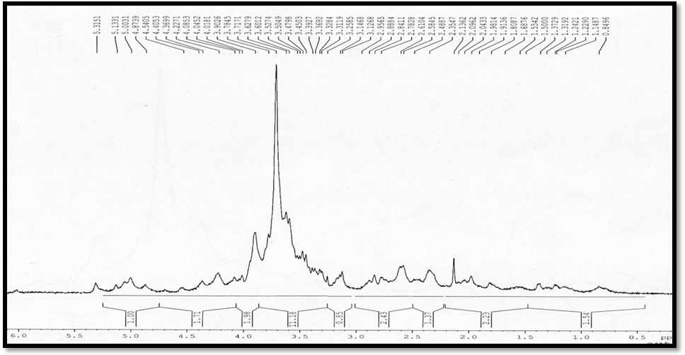 1H NMR of Phaseolus vulgaris biomaterial showed chemical shift at δ 0.84-1.5 ppm (-CH saturated proton), δ 2.1-3.3 ppm (-C≡CH, acetylenic proton), δ 3.1-4.04 ppm (-CH3OR, ether proton), δ 4.54 ppm (-C=CH, vinylic proton) and δ 5.31 ppm (R-OH, hydroxyl proton) Fig.- 6.