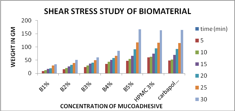 For the in vitro evaluation of the biomaterial’s adhesive strength a Shear Stress study was performed. In this method the concentrated solutions of the biomaterial varying between 1 to 5% w/v were prepared by using water as a solvent. All the prepared concentrated solutions of the biomaterial was used to measure the adhesive strength in terms of the weight required for breaking adhesive bonds between the biomaterial and the glass plate in a designated contact time of 5,10,15,20,25 and 30 minutes[19]. The similar procedure was employed for the HPMC and carbapol 934 as a standard.