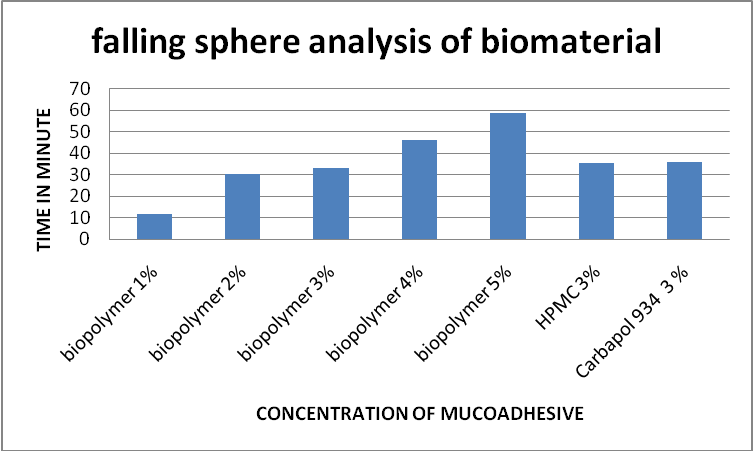 In falling sphere method the Coated mustard grains of size 1.0 to 1.1 mm were allowed to move top to bottom in 50 ml burette containing 10% mucus solution. Mucoadhesion time was determined and compared with standard. From the study it was found that the isolated biooadhesive agent was shown comparable biooadhesion as compared to the standard Fig.-8.