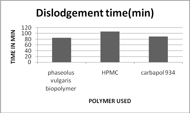 Phaseolus vulgaris biomaterial showed dislodgement time 85 minutes from nasal mucosal substrate of goat, which was more than carbapol 934 (90 minutes) and less than HPMC (107 minutes). These results suggested that Phaseolus vulgaris biomaterial possessed an appreciable mucoadhesive property Fig. - 9.
