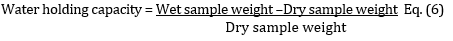 Biomaterial powder was used to determine the water holding capacity The samples were accurately weighed (0.125 g), added with 12.5 ml distilled water, mixed by magnetic stirrer for 15 min, and centrifuged at 10000 rpm for 30 min. Then the supernatant was removed, the wet samples were weighed and used in calculating the water holding capacity by the equation-6.