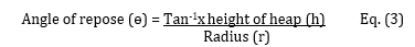 Angle of repose (ө) was determined using funnel method. The dried biomaterial powder was poured through a funnel that can be raised vertically until a maximum cone height (h) was obtained [6, 7]. The radius of the heap(r) was measured and angle of repose was calculated using equation-3.