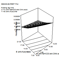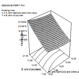 The data demonstrated that both factors A and B affect FT and FLT. As the concentration of B increased from 7 % to 21% FT is increased up to 10 h. FLT in increased up to 4 min as sodium bicarbonate and citric acid concentration increases for 6 to 12 % w/w. Desirable FLT i.e. 3 min and FT i.e. 10 h are achieved by increasing concentration of HPMC K4M and maintaining the optimum concentration of sodium bicarbonate and citric acid.
