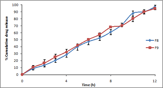 Fig. 4: In vitro drug release of FMT formulations F8 and F9 (mean±SD of three replicate experiments)