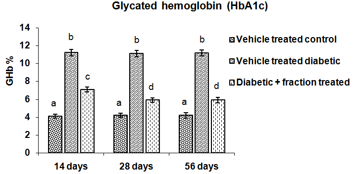 Glycated hemoglobin (HbA1c) level was significantly elevated (p<0.05) in all the vehicle-treated diabetic groups i.e. 14, 28 or 56 d experimental schedule in respect to the corresponding vehicle-treated control groups. Administration of ethyl acetate fraction of methanolic extract of C. sinensis at the dose of 100 mg/kg body weight in 2 ml of distilled water two times/day for the duration of 14 or 28 or 56 d to diabetic rats, a significant diminution (p<0.05) in the level of this parameter was observed in respect to vehicle-treated diabetic group of respective experimental schedule. Treatment of ethyl acetate fraction for the duration of 28 or 56 d to the diabetic rats resulted in more significant recovery (p<0.05) in the level of glycated hemoglobin in respect to 14 d fraction treated diabetic animal towards the control. No significant difference was found in the value of the above parameter when the results were compared between the 28 or 56 d of ethyl acetate fraction treated diabetic groups which indicated that 28 d is the threshold duration of treatment in this concern (fig. 1).