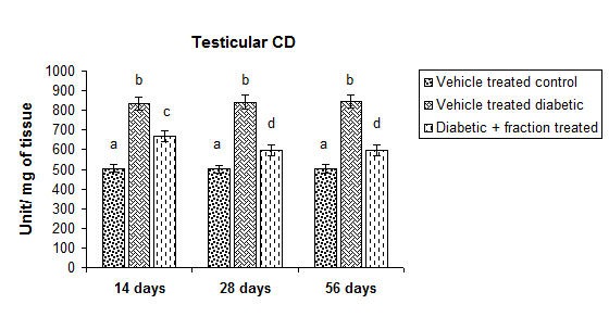 A significant elevation (p<0.05) was observed in the levels of CD and TBARS in the testicular tissues in all the duration dependent diabetic groups when the comparison was made to their respective control group for the said treatment schedules. There was significant (p<0.05) corrections in the quantity of said parameters towards their control levels after treatment with ethyl acetate fraction for 14 or 28 or 56 d duration. Out of these, ethyl acetate fraction treatment for a period of 28 or 56 d produced rectifications that significantly (p<0.05) higher with rectification achieved after 14 d of fraction treatment. The levels of these parameters were found with insignificant (p>0.05) difference from each other for the treatment period between 28 or 56 d (fig. 2 A, B).