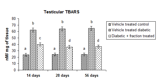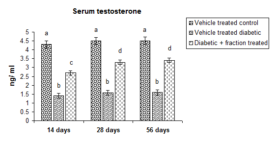 Level of serum testosterone was significantly decreased (p<0.05) in all the duration dependent diabetic groups in respect to the vehicle-treated control group. Treatment with above-said fraction for the duration of 14 or 28 or 56 d to diabetic rats resulted in a significant recovery (p<0.05) in the level of serum testosterone in respect to diabetic group. Results focused that 28 or 56 d of fraction treatment resulted in a significant correction (p<0.05) in compare with 14 d of fraction treated diabetic groups. There was no significant variation in the levels of this parameter between 28 or 56 d fraction treated diabetic groups (fig. 5).
