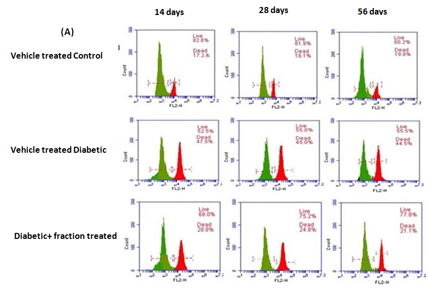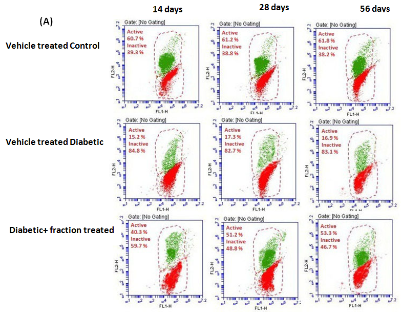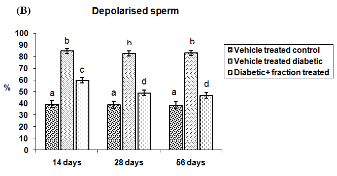 Depolarised sperm indicated the low mitochondrial status of sperm. Percentage of sperm with the depolarised mitochondrial membrane was increased significantly (p<0.05) in all the duration dependent vehicle-treated diabetic groups in respect to the vehicle-treated control group of corresponding experimental schedule. Numbers of depolarised sperm were decreased significantly (p<0.05) in diabetic animals treated with above-said fraction for 14 or 28 or 56 d in compare with the corresponding vehicle-treated diabetic animals. It was also observed that 28 or 56 d fraction treated groups showed significant promising effect (p<0.05) than 14 d treated diabetic group. No significant variation in the level of this parameter was observed between 28 or 56 d fraction treated diabetic groups (fig. 4 A, B).