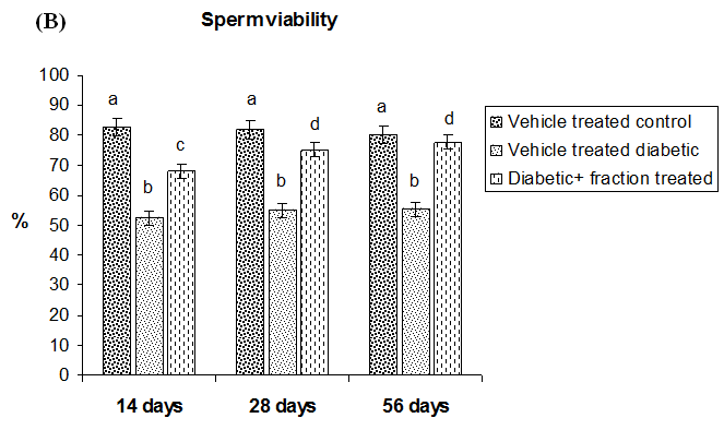 Fig. 3: Corrective effect of ethyl acetate fraction of C. sinensis on epididymal sperm viability. (A) Histogram of sperm viability stained with propidium iodide (PI) by flow cytometric analysis. (B) Bar diagram of viable sperms in fraction treated group. Bars indicate mean±SEM (n = 6). ANOVA followed by multiple comparison student’s two-tail t-test. Bars with different superscripts (a, b, c, d) differ from each other significantly, p<0.05