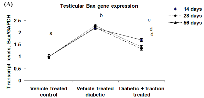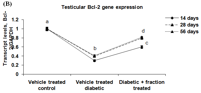 Upward and downward expression patterns were noted in case of the pro-apoptotic gene, i.e. Bax and anti-apoptotic gene, i.e. Bcl-2 in testicular tissue respectively through qRT-PCR analysis in the diabetic group when compared to the vehicle-treated control group. A significant (p<0.05) recovery was observed towards the control group in the expression levels of Bax and Bcl-2 genes after treatment with above-mentioned fraction for the duration of 14 or 28 or 56 d in diabetic rat. When the results of 28 or 56 d fraction treated groups compared with 14 d fraction treated group, it was observed that 28 or 56 d duration significantly effective (p<0.05) in this concern in compare with 14 d duration of treatment. No significant difference was noted between 28 or 56 d of fraction treatment to diabetic animals (fig. 6 A, B).