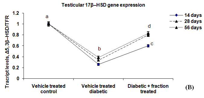 Levels of expression of testicular Δ5, 3β-HSD and 17β-HSD genes were decreased insignificant level (p<0.05) in the diabetic group in respect to the control group. After treatment with above-said fraction for the duration of 14 or 28 or 56 d to diabetic rats resulted in a significant recovery (p<0.05) in the transcript levels of concerned genes in respect to diabetic group. Results focused that 28 or 56 d of fraction treatment resulted in a significant correction (p<0.05) in compare with 14 d of fraction treated diabetic group. There was no significant variation in the levels of this parameter between 28 or 56 d fraction treated diabetic groups (fig. 7 A, B).