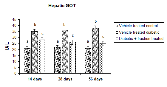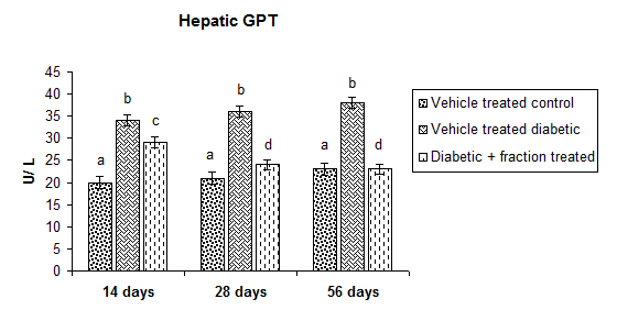 Activities of hepatic GOT, GPT were increased in all duration dependent diabetic groups when the comparison was made with the vehicle-treated control group. Above said fraction treatment for the duration of 14 or 28 or 56 d to diabetic rats can able to recover the enzyme activities towards the control at a significant level (p˂ 0.05) (fig. 8 A, B).