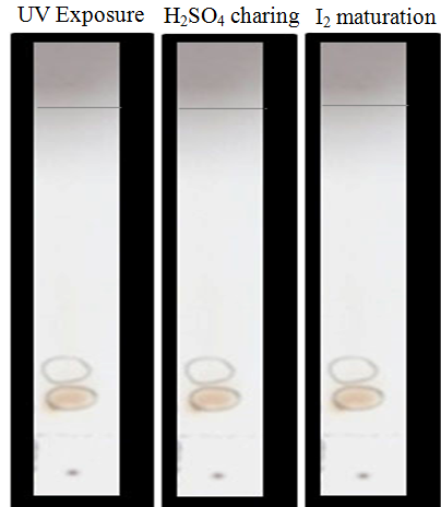 Two spots were found from the analytical study of thin layer chromatogram of an ethyl acetate fraction of C. sinensis (fig. 9) after examined in UV cabinet at short wavelength 254 nm and long wavelength 366 nm, H2SO4 charing and Iodine maturation. Retention factor (Rf) of these compounds were 0.78 and 0.51 and the running distance of solvent was 7 cm (fig. 9).
