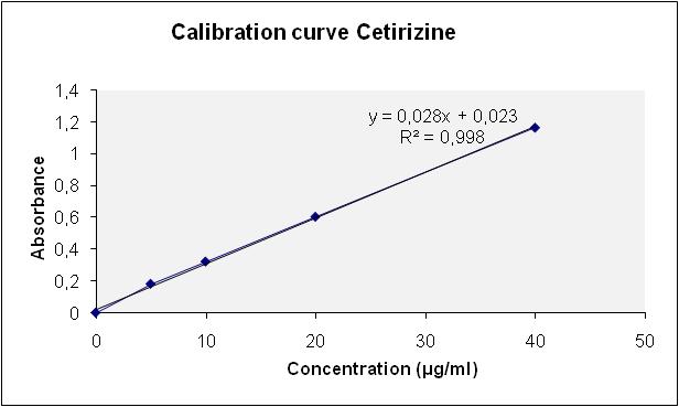 100mg of cetirizine hydrochloride were dissolved in 50 ml of water, stirred with “ultrasonic” for 30 minutes and then filled with up to 100 ml of water. The mother solution with a concentration of 1mg/ml, filtered beforehand, was then used to make up the standard solutions (5, 10, 20, 40 µg/ml). The diluted solutions were then scanned using a Varian Cary UV-Vis spectrophotometer in the range [200-400 nm]. Absorption maximum was obtained at 230.1 nm. A standard curve was plotted to study the linearity of Beer Lambert’s Law.