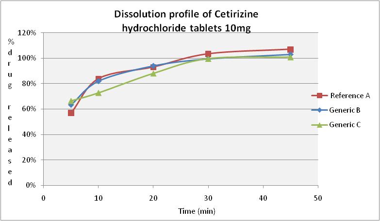 Fig. 2: Dissolution profile of cetirizine hydrochloride tablets 10mg (Reference A, Generic B, Generic C)