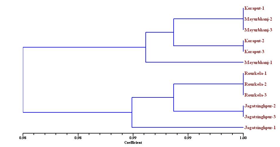 Total 158 bands were amplified in total where 152 were monomorphic and 6 polymorphic table 1. Samples correlation was done with an average similarity of 0.993 ranging between 0.967 to 1.000. A dendrogram was constructed using Jaccard’s similarity coefficient which resulted in 2 major clusters, 1 with six samples and the others at 0.98 similarity coefficient fig. 1. Again these were subdivided into 2 subclusters, one containing the single sample and others in 2 subcluster. The Koraput and Mayurbhanj were present in Cluster I and Rourkela and Jagatsinghpur in Cluster II.