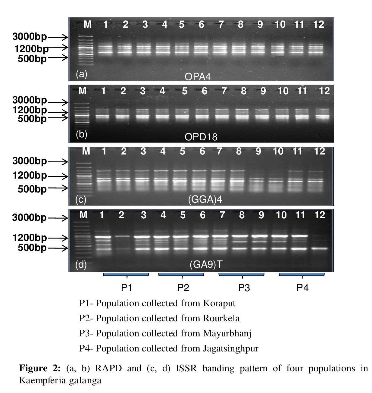 Kaempferia galanga were collected from the wild habitats of Koraput (18 °82' N, 82 °72' E), Rourkela (22 °25' N, 85 °00' E), Mayurbhanj (21 °93' N, 86 °73' E) and Jagatsinghpur population (20 °16' N, 86 °10' E) of Odisha. DNA isolation from fresh 2 gm of leaves was done by Doyle and Doyle method [11]. Polymerase Chain Reaction (PCR) techniques namely Random Amplified Polymorphic DNA (RAPD) and Inter-Simple Sequence Repeats (ISSR) were done [12,13]. RAPD primers (Operon Tech., Alameda, USA) were dissolved in double sterilized T10E1 buffer, pH 8.0 to the working concentration of 15 ng/µl. 19 RAPD primers as per banding pattern were selected namely A4, A7, A9, A18, C2, C5, C11, D3, D7, D8, D12, D18, D20, N4, N16, N18, AF5, AF14 and AF15. 9 ISSR primers similarly used as (GAC)5, (GTGC)4, (GACA)4, (AGG)6, (GA)9T, T(GA)9, (GTG)5, (GGA)4 and (CAA)5 from Bangalore Genei Pvt. Ltd, India. PCR product for both RAPD and ISSR was electrophoresed with 1.5% and 2% agarose gel and ethidium bromide at 60 volts for three hours. These were visualized in UV-transilluminator (BioRad, USA) and gel documented in Gel Documenting System (Bio-Rad, USA) for band details.